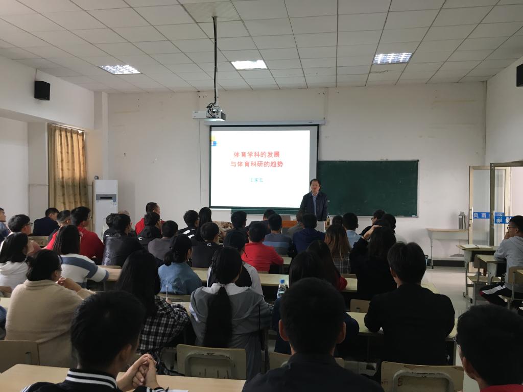 首先,王家宏教授系统回顾了我国体育学科的发展历程,分析了体育团队建设中存在的主要问题,就我国体育学科研究动态、体育学科方向的不断涌现阐述了我国体育学科发展趋势,并提出了体育学应脱离教育学门类,单列体育学学科门类的构想。其次,重点分析了体育科学研究的发展趋势,就体育科学研究中“体育重点支持的领域”、“健康中国的建设与体育的发展”、“运动精英训练制度与大众体育制度”、“建设体育大国与体育强国的研究”、“深化体育管理”等热点问题与在座的师生们进行了交流探讨。