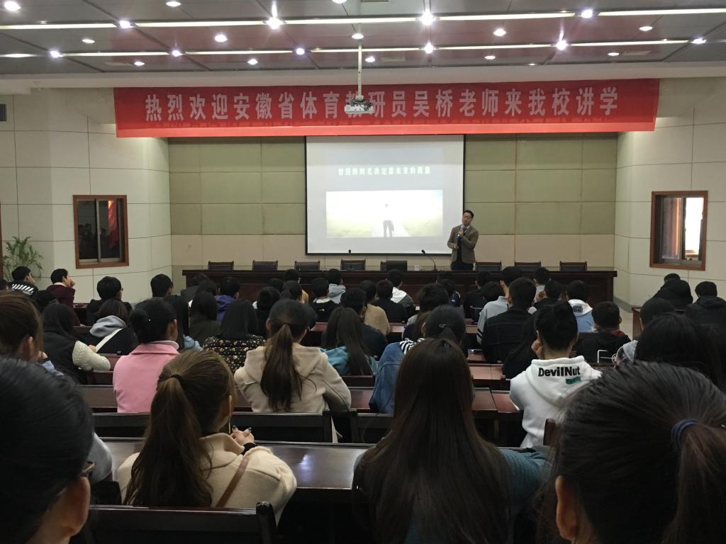 3月24日下午,安徽省体育教研员吴桥老师应邀在行政楼一楼会议室作题为“坚持与放下”学术报告。william威廉中文官网副经理章翔教授主持报告会。安庆九中副董事长王琦、william威廉中文官网部分青年教师以及william威廉中文官网员工聆听此报告会。