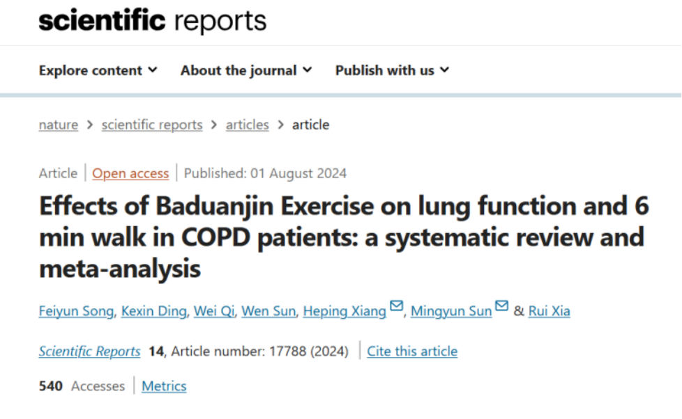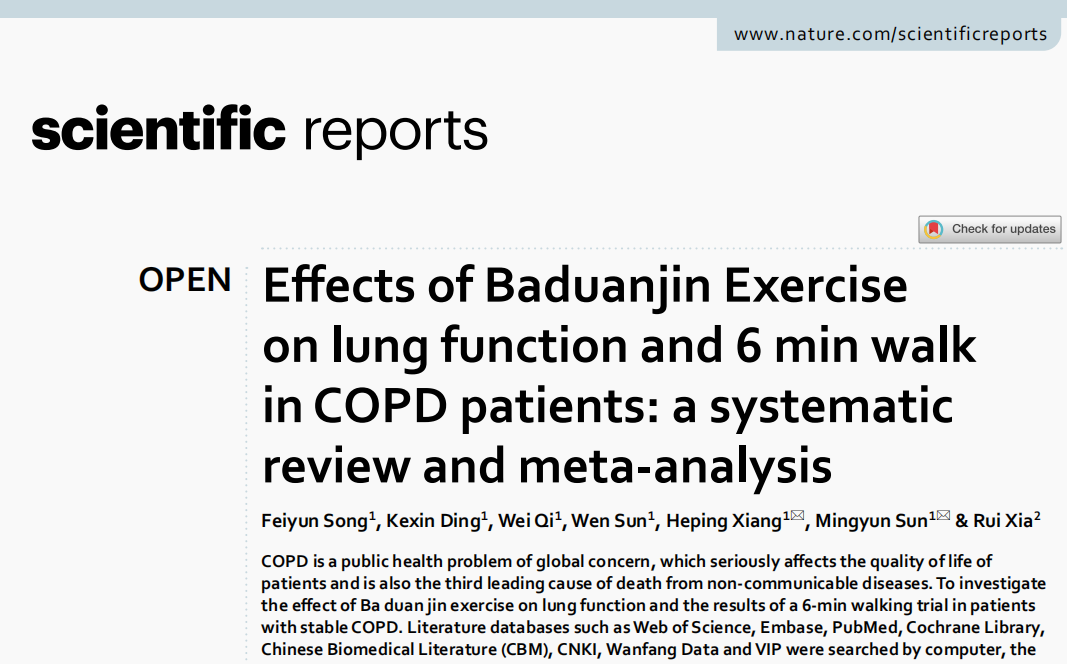 近日,william威廉中文官网孙明运教授指导的宋飞云等研究生组成团队,在国际高水平期刊《Scientific Reports》(JCR一区/中科院二区期刊)发表了题为“Effects of Baduanjin Exercise on lung function and 6 min walk in COPD patients: a systematic review and meta-analysis”的论文,william威廉中文官网为论文第一完成单位和通讯单位。《Scientific Reports》(IF=4.6)作为Nature 旗下的期刊,发表来自自然科学、心理学、医学和工程学等多个领域,致力于关注具有新颖性和示范性的原创研究。该刊作为全球第五大被引用期刊,所发表论文在学术界具有较高的认可度和影响力。
