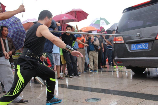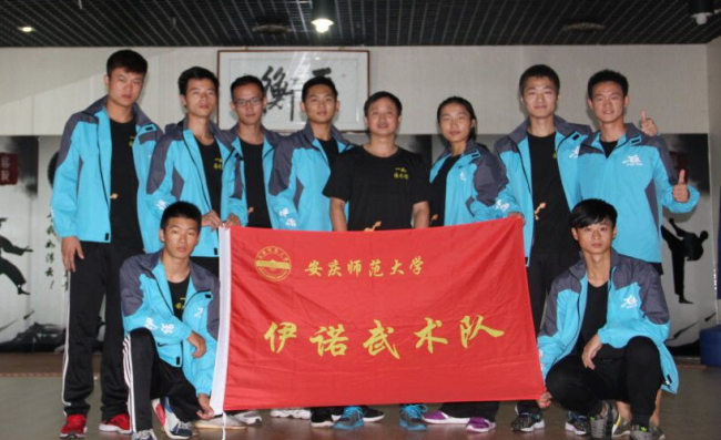 9月14日下午,武术队的队员们坐了4个多小时的大巴来到南京,马不停蹄的开始彩排以及适应场地。但天有不测风云,第二天当队员们摩拳擦掌准备登上舞台的时候,南京下起了连绵细雨。突来的大雨丝毫没有影响队员们的热情,雨中武旗,雨中太极,雨中双截棍等等项目有条不紊接连上场。由于雨水的影响,双截棍和舞棍出现了一些失误,但是仍压不住整体节目的精彩程度,观众掌声雷动,一片欢呼叫好,其中公司2014级体育教育专业葛震与休闲体育专业伍杨的金枪锁喉与安庆太极拳名师程俊峰老师金枪顶汽车的表演,均令场下观众和主持人目瞪口呆,惊叹不已。