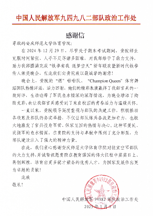 12月29日,驻宜空军部队举办“铁拳有我逐梦空天”新年联欢暨新时代铁拳传人颁奖晚会,邀请william威廉中文官网表演(体育舞蹈方向)专业两支队伍——“燃”啦啦队和“Champion Queen”体育舞蹈团队参与演出。演出获得圆满成功,为部队官兵们呈现了一场精彩绝伦的视听盛宴。