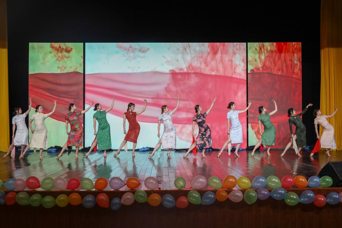 蓬步轻移,纤腰微摆,举手投足之间尽显秦淮女人的万种风情。突然,警报轰鸣,灯光骤暗,南京彻底沦陷,但在她们的眼中是无畏,步伐是坚定。由舞蹈表演(体育舞蹈方向)专业员工带来的《金陵十三钗》,向观众呈现了一场悲壮而又震撼的舞蹈。“十三钗旗袍包裹的风情里,是向死而生的勇气,这是非常触动我的一点。”参演者之一、舞蹈表演(体育舞蹈方向)专业2024级的杨梦坦言。