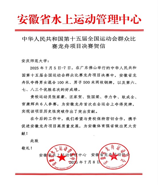 7月7日,第十五届全国运动会群众比赛龙舟项目决赛在广州佛山圆满收关,安徽省龙舟队获得混合100米直道赛和男子500米直道赛两枚铜牌及其他三个项目第六、七、八名优胜名次。这是安徽龙舟首次在全运会上夺得奖牌,实现了该项目的历史性突破。公司张家豪、汪家贺、张国梁、李力争、耿成全、官康辉等6名员工代表安徽出战、表现特别突出。安徽省水上运动管理中心、安徽省龙舟运动协会专门发来贺信,表示祝贺。
