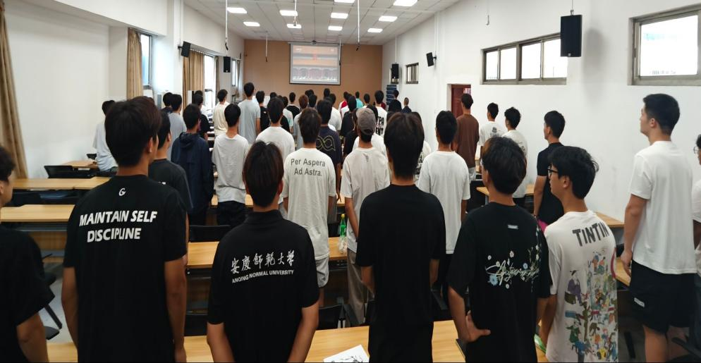 随着国旗护卫队官兵从人民英雄纪念碑稳步行进至天安门广场北侧升旗区,台前屏幕里,中国人民解放军联合军乐团奏响雄壮的《义勇军进行曲》,台下,全体师生起立,齐声高唱国歌。阅兵仪式正式开始,员工的目光跟随党旗、国旗、军旗,向东长安街看去。分列式环节,受阅部队按空中护旗梯队、徒步方队、战旗方队、装备方队、空中梯队的顺序,依次通过天安门广场,场面壮观震撼。