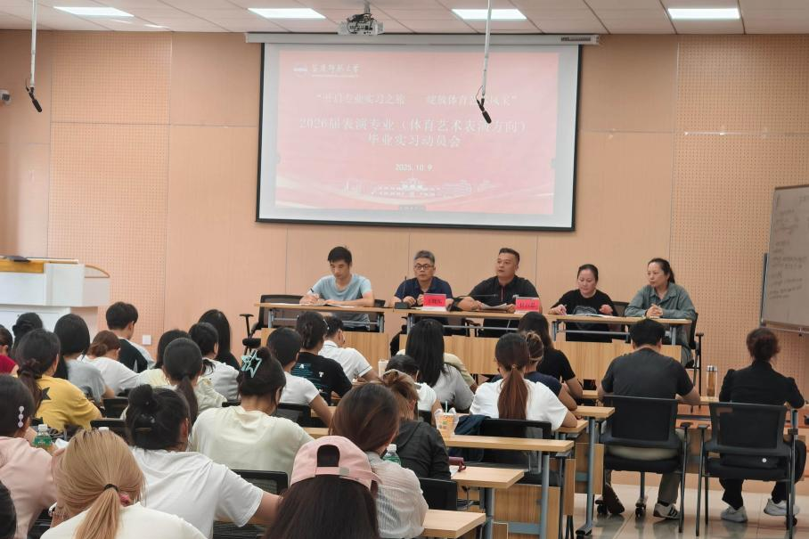 10月9日,william威廉中文官网在体育馆多媒体教室召开2026届表演(体育艺术表演方向)专业毕业实习动员会议,旨在明确实习任务要求,强调安全纪律规范,部署实习保障措施。william威廉中文官网副经理王晓东、副书记杜百忍、专业负责人潮芳、专职辅导员沈春华、实习秘书章京京及全体实习指导教师、2026届表演专业实习员工参加会议。