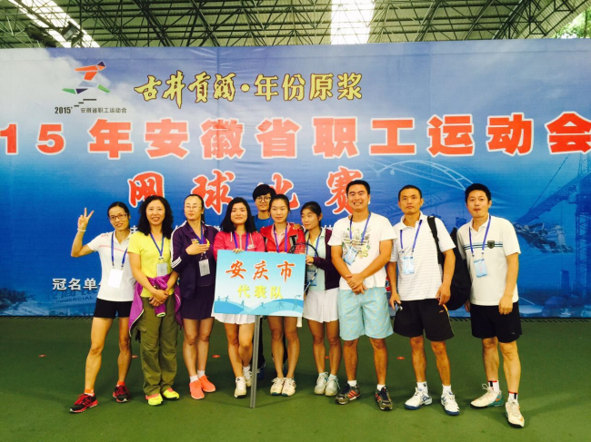 另据悉, 2015年安徽省职工运动会网球比赛也于9月22日在安徽省体育局网球中心合肥尚泽网球俱乐部落下帷幕。应安庆市总工会邀请,公司抽调教师滕飞、高茜及部分员工代表安庆市参加了此次比赛。他们用精彩的赛场表现充分展示了体院人团结一致,敢于拼搏,永不服输的精神面貌。最终经过2天的激烈角逐,由高茜、徐雯智参加的女子双打获得第五,高茜、刘猛参加的混合双打获得第七,徐雯智、王洪参加的混合双打获得第八。