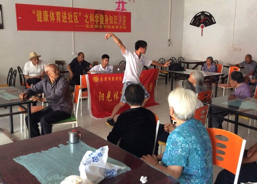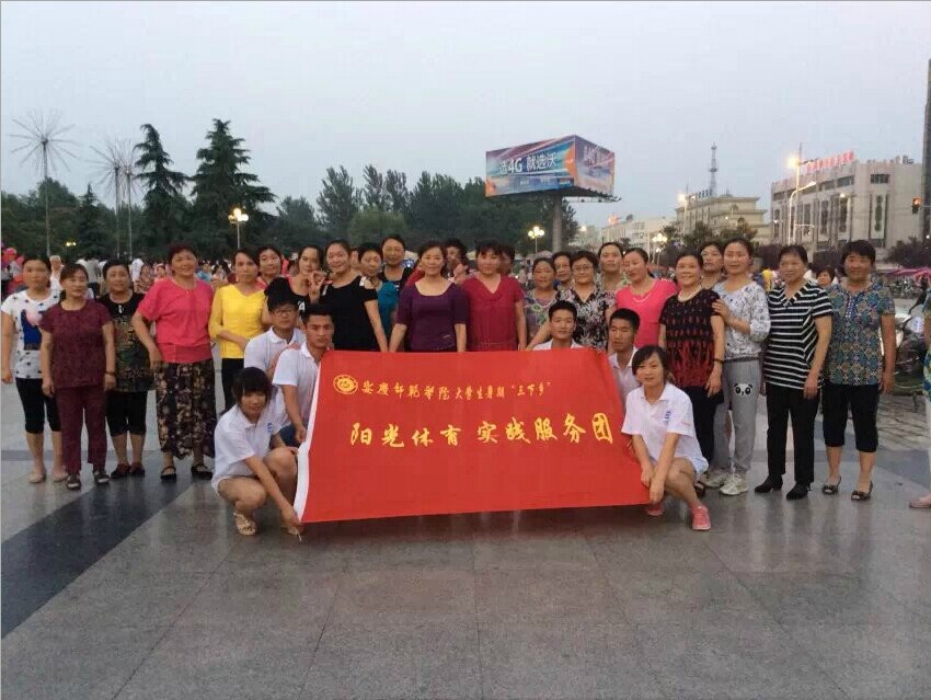 活动第一天,在团队负责人体育教育专业2012级吴华东同学的带领下,队员们前往蓼都社区,拉开此次“三下乡”活动的序幕。队员们首先对社区居民进行了问卷调查,在了解他们日常锻炼和生活习惯的基础上,对他们进行了科学运动的指导,强调科学健身的重要性,我们的队员一边讲解一边还向居民们展示了武术、健身操、舞蹈等体育项目的魅力,他们的表演受到当地群众的广泛欢迎。活动第二天,前往玉泉社区,在积累第一天活动经验的基础上,无论是问卷调研环节,还是健身辅导环节,都进行了更加顺利。根据安排,活动的随后几天里,服务团的成员还将陆续前往霍邱县爱心养老院和青少年活动中心,对于不同年龄层次的人群,有针对性地进行各类体育项目的宣传和教学。