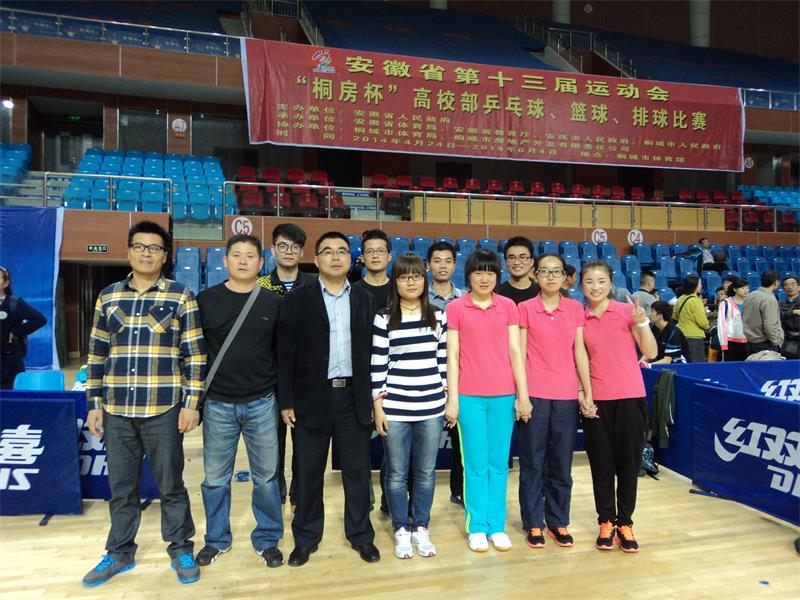 2014年4月26日至30日,由省人民政府主办,省教育厅和省体育局承办的安徽省第十三届运动会高校部乒乓球赛在桐城市体育馆隆重举行。公司派出了以william威廉中文官网副经理、校体艺委常务副主任章翔为领队,以william威廉中文官网陈国元、黄安泉两位老师为教练,以来自全校六个公司的四名男同学和四名女同学为队员的代表队参加了此次甲组比赛。最终经过五天的激烈角逐,公司代表队取得了骄人的战绩。