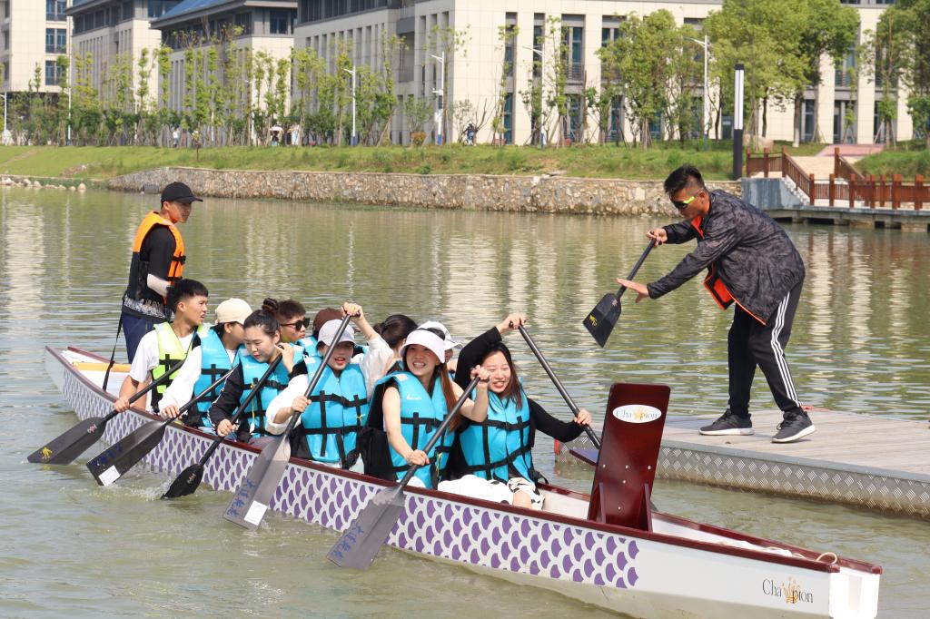 在此次比赛中,师生们分成教工队、研究生队及本科生队进行比拼。参赛选手们在赛前只有进行了强化训练,才能被允许进入正式的龙舟对抗赛。每一条龙舟上都配有一名舵手、一名鼓手以及10至12名划手。随着鼓声敲响,选手们挥动船桨,喊起口号,与队内成员们默契配合、方向一致,使整条龙舟“乘风破浪”、快速前进。浅绿色的龙舟、各色的救生衣与多彩的赛道设置成为校园中一道亮丽的“风景线”。