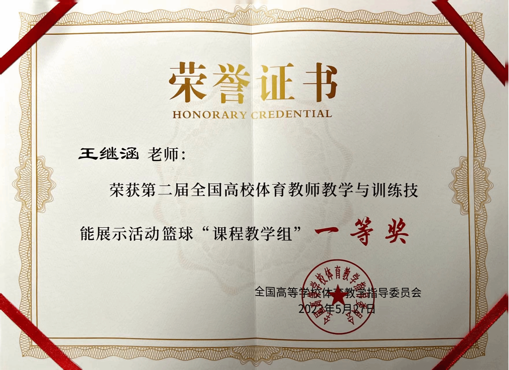 公司王继涵老师荣获第二届全国高校体育教师教学与训练技能展示活动篮球教学课程组一等奖