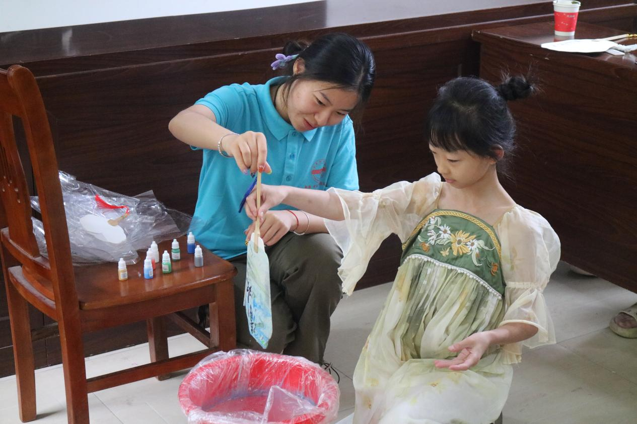 “这是我第一次看到这么漂亮的扇子,上面的图案好特别啊!”体验制作的朱希辰说。一把把颜色各异、生动别致的漆扇在团队成员和孩子们的手中轻轻摇曳,仿佛一幅幅生动的画卷。“这些都是宝贵的非遗文化,每一把漆扇都有它独特的韵味。希望你们能喜欢,并传承下去。”杨子娴对小朋友们说道。