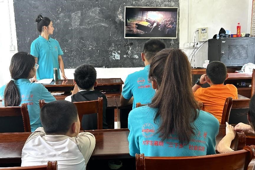 面对一张张稚嫩的面庞,唐丽妍不禁发问:“小朋友们,你们知道即将到来的8月1日是什么节日吗?”整齐围坐的孩子踊跃举手,高声呼喊:“建军节!”他们用最淳朴的方式表达对建军周年的真挚祝福。当地缺乏投影器材和音响设备,西冲村村民委员会二楼会议室中一台电视机便成为了实践团开展观影红色教育的“主阵地”。