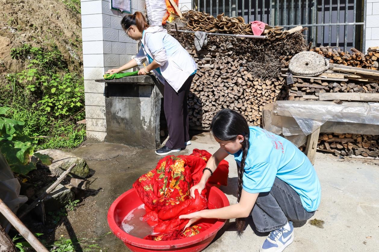 在看到烈日下全身汗湿的爷爷在洗着厚重的被子,团队两位成员上前帮忙,开启“温情洗护”行动。尽管缺乏经验,她们也认真反复的搓洗,从满是泡沫的双手,到洁净蓬松的被子,这一行动 不仅是为老人分担家务,更是在传递对村民的深切关怀,让乡村烟火日常,多了份青春守护的温暖底色。