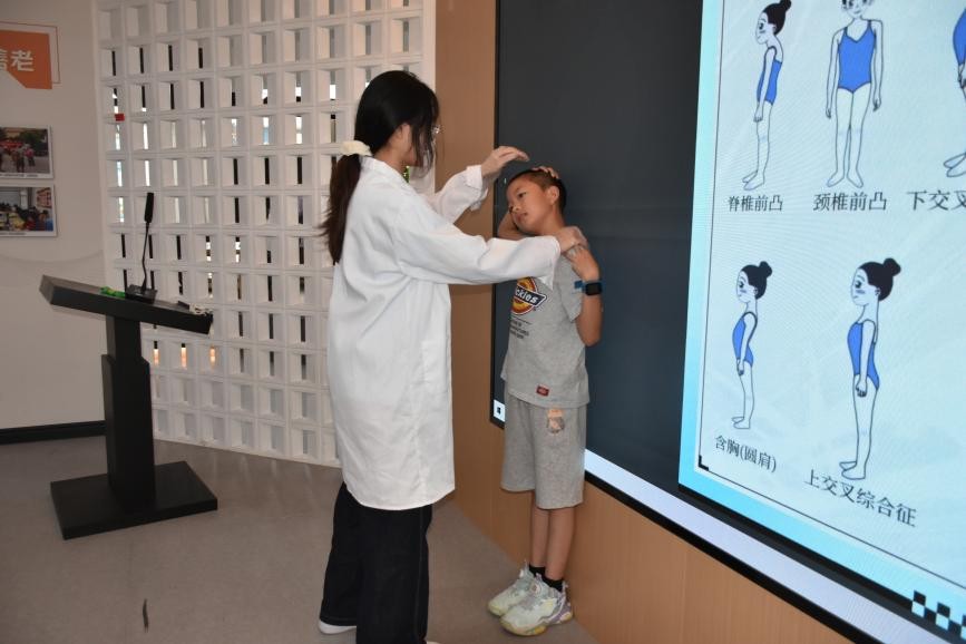 实践团充分发挥运动康复专业优势,在社区活动中心开展 “青少年体态健康筛查与评估”。队员们为孩子们进行了包含脊柱侧弯、圆肩驼背、足弓、身体姿势等多项检查,针对轻度脊柱侧弯、含胸驼背等问题,提供一对一矫正指导,“每天靠墙站5分钟,小背就能更直啦。”轻声细语地指导,让孩子们倍感温暖。