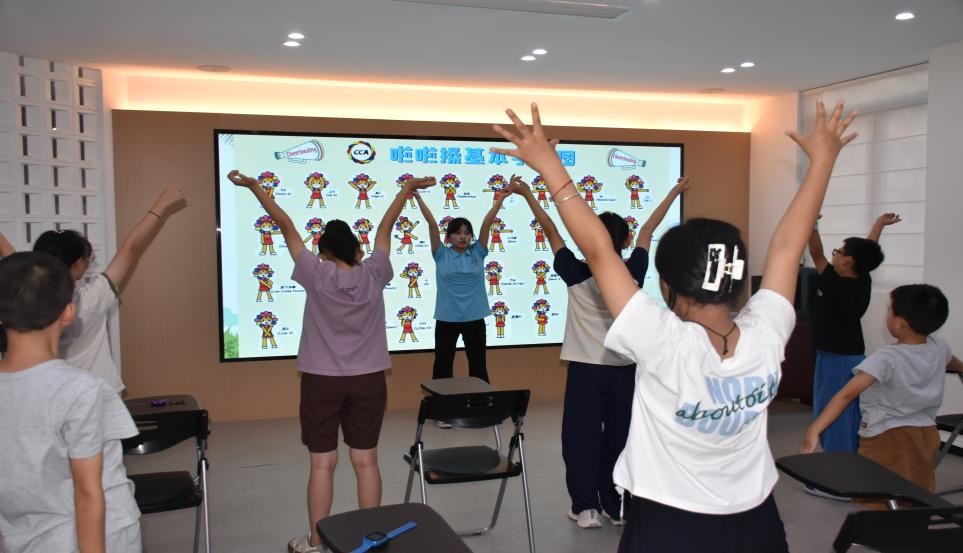 “手臂再抬高一点,跟着节拍跳起来!”体育教育专业 2024级(6)班郭梦带来的啦啦操课程,点燃了孩子们的热情。针对青少年的协调性、节奏感发展需求,队员们编排了动作简洁、音乐昂扬的啦啦操,耐心纠正细节动作。课堂上,孩子们蹦跳欢呼,活动场地洋溢着青春活力。课程结束时,孩子们拉着实践团队员衣角不舍地说:“老师,我们再跳一遍吧!”