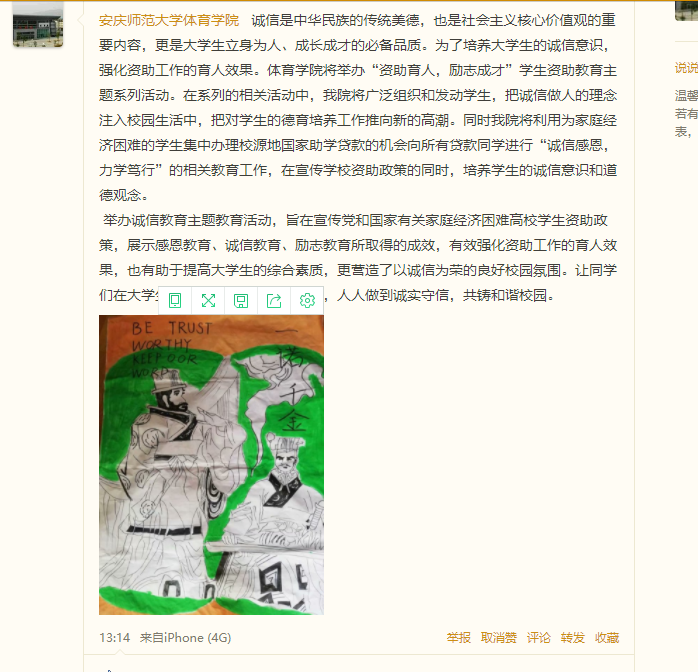 活动各通过悬挂诚信宣传横幅、制作诚信宣传板报、召开诚信宣讲会、组织员工进行诚信宣誓并签字、举办诚信知识竞赛活动、开展诚信教育主题班会、在公司微博上开设诚信教育专栏等举措,在全院范围内形成了人人“讲诚信”“重诚信”“真诚信”的良好风气,有力推动了公司国家助学贷款工作持续健康发展。 (陈守朋)
