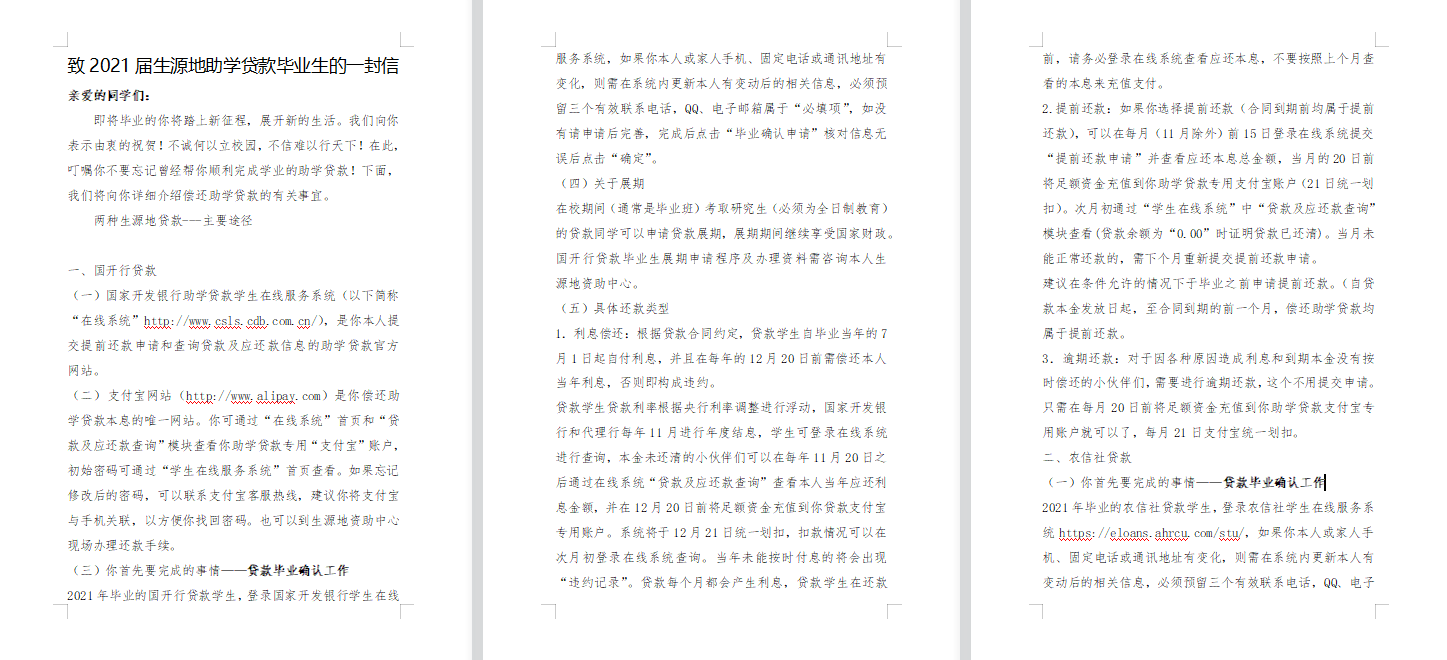 为保证生源地信用助学贷款持续健康的发展,公司组织了2021年毕业的员工贷款确认工作。公司资助老师将《致2021届生源地助学贷款毕业生的一封信》转发给公司专兼职辅导员,并下发至各班级群中,并确保每一位同学都收到有关消息。生源地信用助学贷款员工毕业确认工作,有助于确保生源地贷款的按时回收,加强员工对国家助学贷款及其他资助政策的了解,培养员工们守信做人、心怀感恩、勇担责任的意识。