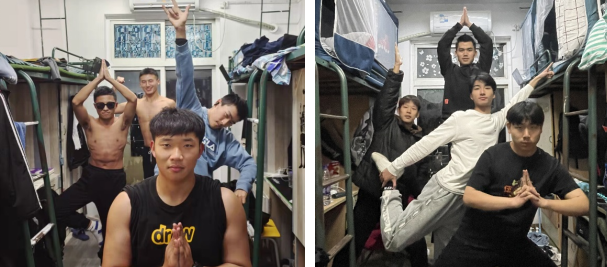 “当时和室友在宿舍健身,正好收到辅导员方老师的查寝通知,就拍了这组照片”对于这套健身动作查寝照,2021级体教教育专业的徐家乐说道:“作为体育生,要将体育精神贯穿在生活中的各个方面”。