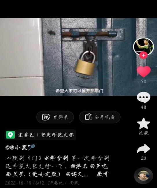 公司组织各班级制作有关心理健康的微视频,进一步做好心理健康知识的宣传和普及。面对镜头,同学们娓娓道来,或是自己的一个小故事,或是为大家讲解一个心理小知识。同学们通过制作心理健康微视频,启发他人心灵,将心理小知识传播给更多的人。体育教育专业2021级6班的徐家乐同学制作了心理微视频作品《门》,在抖音短视频平台上发布,收获一系列点赞和好评。同学们通过微视频的制作与观看,学会用正确的方式调适自己的心理,做健康向上、阳光快乐的新青年。