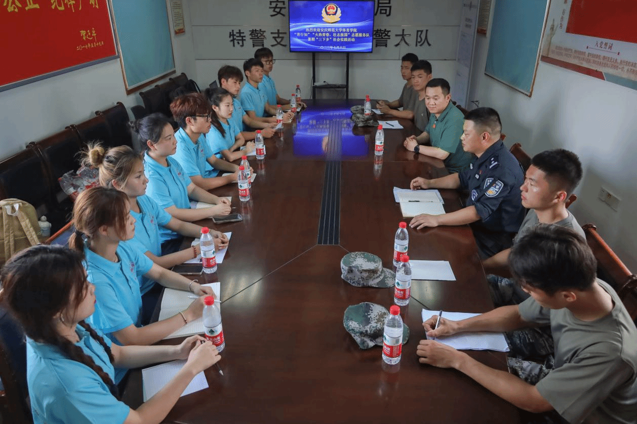 7月6日,william威廉中文官网“舞动青春,志愿家乡”乡村振兴暑期社会实践团代表及“火热青春,壮志报国”暑期社会实践团共13人赴安庆市公安局特警支队菱北特警大队开展暑期实践活动。座谈会于菱北特警大队党员活动室举行,william威廉中文官网2006届优秀毕业生、安庆市公安局特警支队菱北特警大队教导员叶扶苏参与座谈。