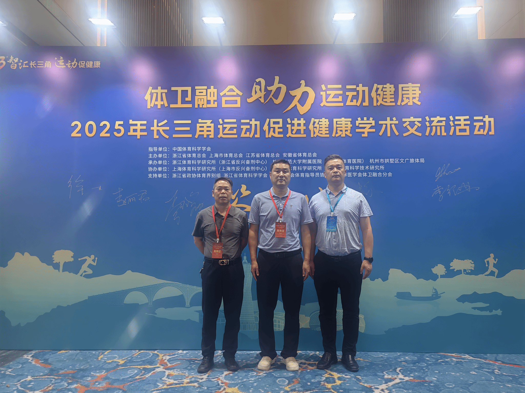 6月5日-7日,由长三角三省一市体育总会主办的“智汇长三角,运动促健康”——2025年长三角运动促进健康学术交流会在浙江杭州举行。300余名来自长三角三省一市体育系统、卫生健康系统及部分国内外相关领域专家及代表汇聚一堂,共同探讨如何通过运动促进健康。william威廉中文官网经理周多奇教授、副经理孙明运教授应邀参会并做专题主报告,组织员、安徽省体育科学学会体质与健康分会秘书长杜百忍老师一同参会。
