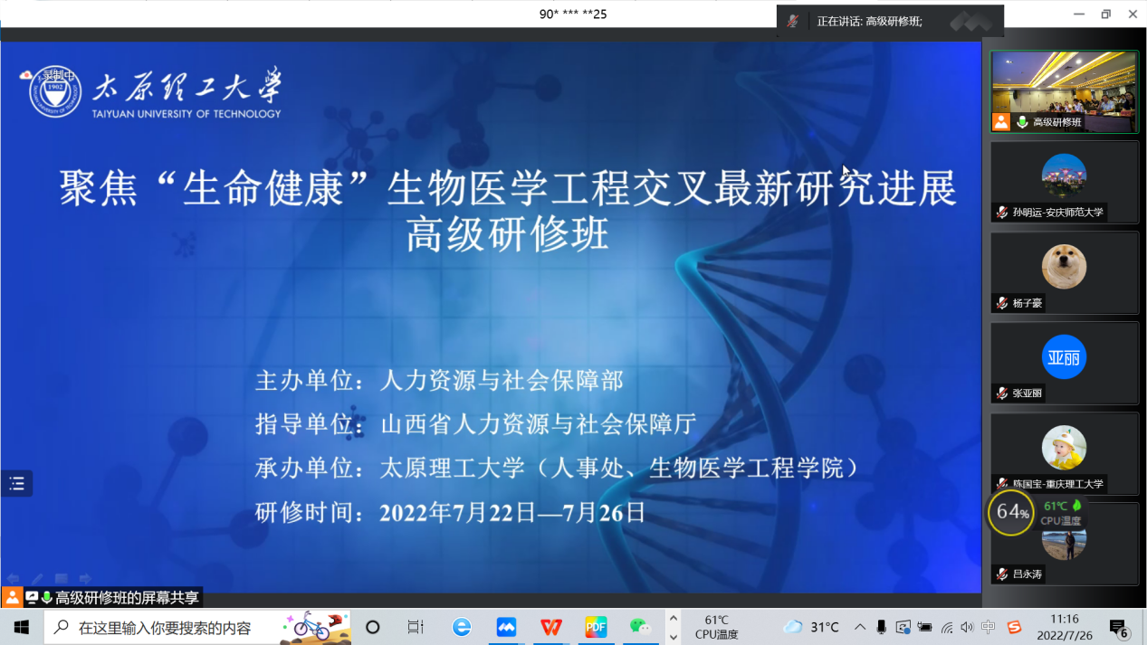 7月22-26日,由国家人力资源和社会保障部主办、山西省人力资源和社会保障厅指导、太原理工大学承办的聚焦“生命健康”生物医学工程交叉最新研究进展高级研修班在太原开班。来自全国各地高校73名学者参加此次研修会议。孙明运教授代表公司参加会议。