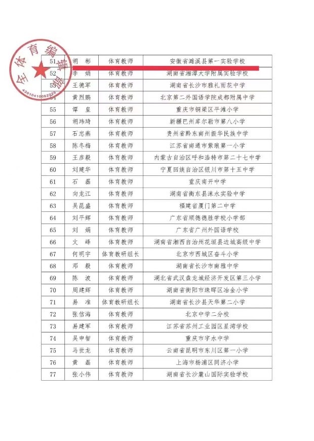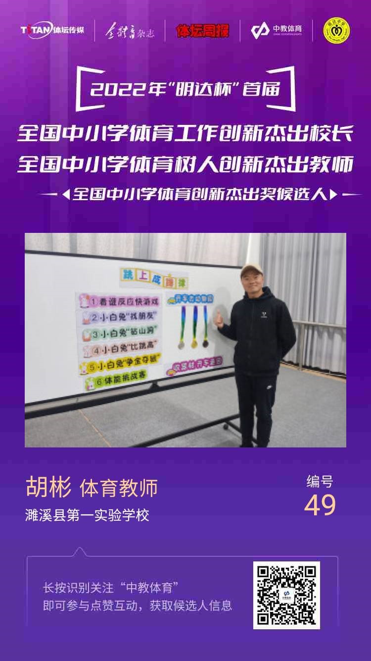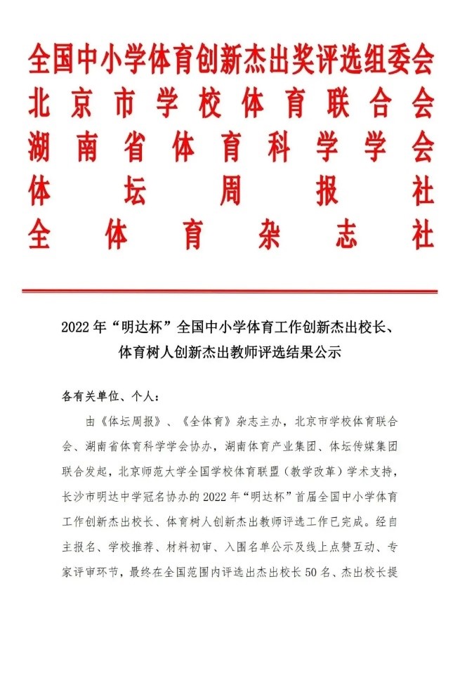 近日,由《体坛周报》、《全体育》杂志主办,北京市公司体育联合会、湖南省体育科学学会协办,湖南体育产业集团、体坛传媒集团联合发起,北京师范大学全国公司体育联盟(教学改革)学术支持,长沙市明达中学冠名协办,中教体育发展(湖南)有限公司承办的2022年“明达杯”首届全国中小学体育工作创新杰出董事长、体育树人创新杰出教师评选结果揭晓。公司小学体育国培班学员胡彬荣获首届“全国中小学体育树人创新杰出教师”称号。