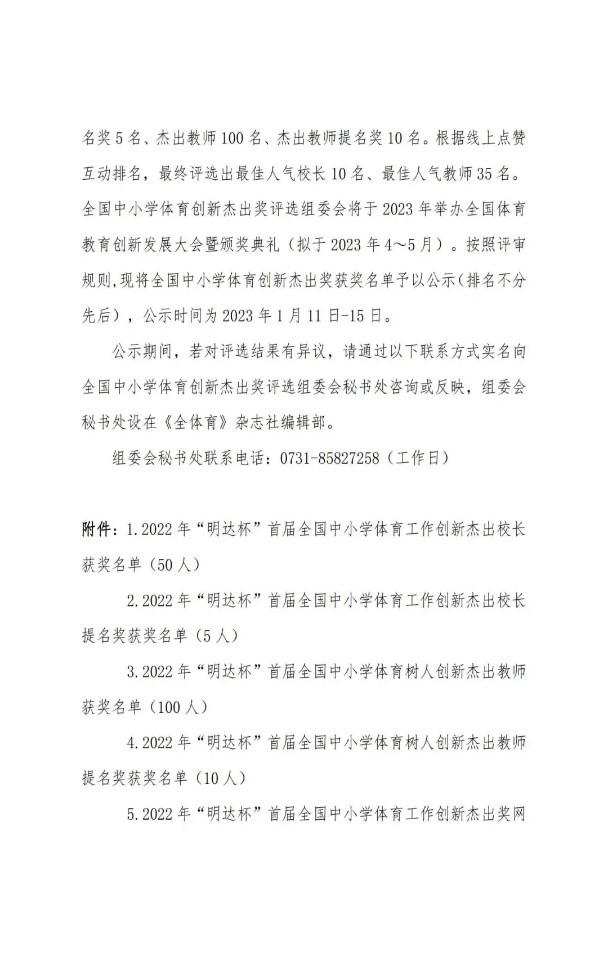 本次“全国中小学体育创新杰出奖评选”于2022年11月正式启动,推出了体育工作创新杰出董事长与体育树人创新杰出教师两大奖项。全国各中小学数百名董事长、体育教师通过初审进行参评。