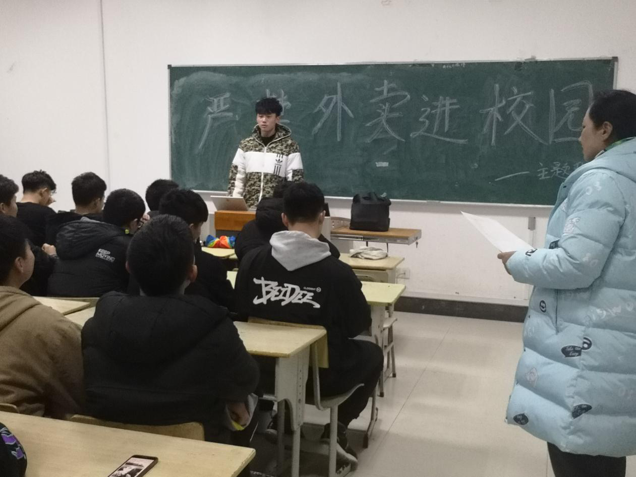 为进一步提高员工食品安全意识,2019年 3月1日和3月2日晚间体育公司18级体育教育专业和体育表演专业共9个班相继于体育馆多媒体教室开展了严禁外卖进校园”主题班会。